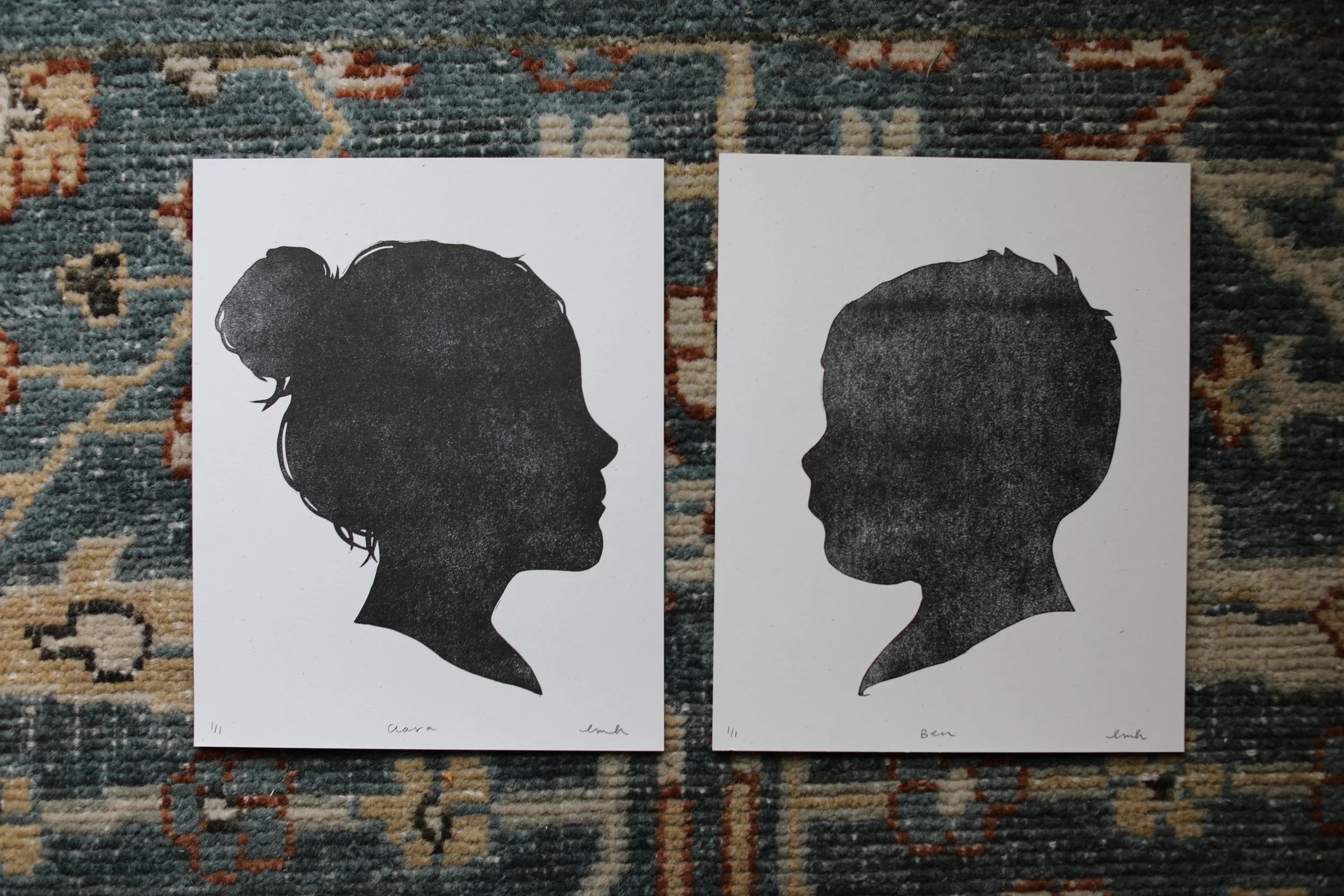 When my older sister turned 40 this past February, I spent quite a bit of time wracking my brain for a good gift. After realizing that I have gotten her enough cookbooks and flower bouquets over the years, I had the idea to carve custom linocuts of her kids’ silhouettes and print them for her. I stealthily Facetimed my niece and nephew and got them to turn to their profile so I could screengrab their faces, then went to work turning the photos into linocuts. I sent sets of 4 prints in different ink and paper color combinations to my sister, not only giving her a few sets of her own, but gifting her this year’s Christmas present for her in-laws. Win-win!